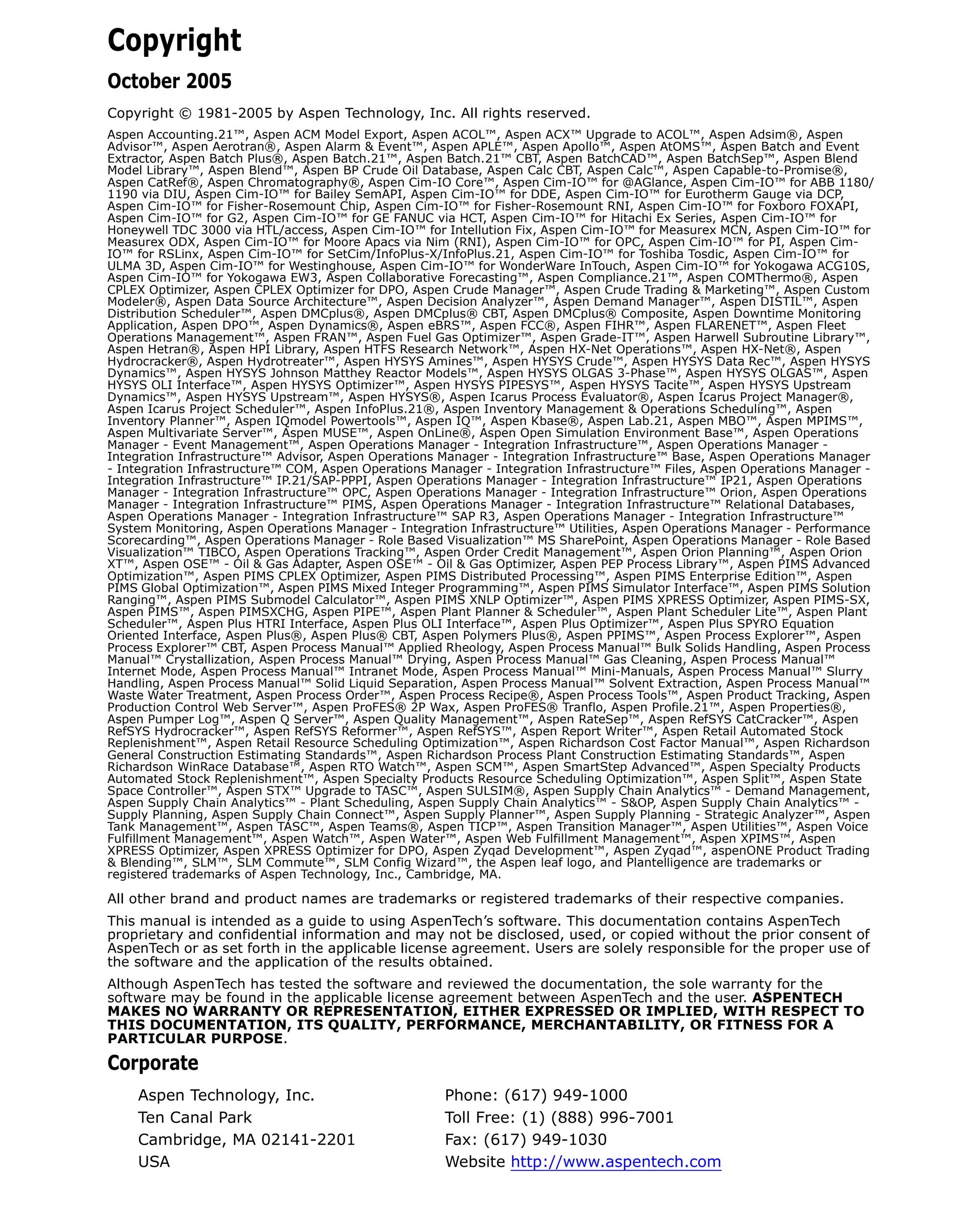 This document provides copyright information and technical support contact details for Aspen Technology's HYSYS 2004.2 Dynamic Modeling software. It lists over 200 Aspen product names that are copyrighted and/or trademarked by Aspen Technology. Contact information is provided for Aspen's Online Technical Support Center, phone support, and email support.