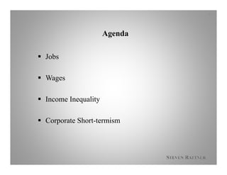 The document summarizes issues facing capitalism today including jobs, wages, income inequality, and corporate short-termism. It finds that while the jobs picture has been strong, labor force participation is falling. Wages have barely risen despite rising productivity and corporate profits reaching near record highs. This is largely due to globalization, technology, tax policy, declining unionization, and "winners-take-all" labor markets. The U.S. also has the highest income inequality among developed nations and does less to redistribute income. However, business spending and R&D are better than perceived and firms that invest more in R&D see higher stock performance, suggesting corporations may not be as short-term as often believed.