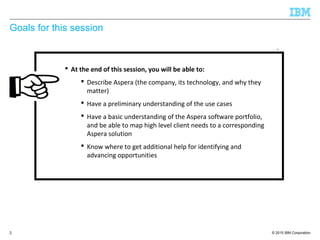 This document provides an overview of an Aspera software session. It discusses Aspera's patented FASP technology which can transfer files thousands of times faster than FTP. The document outlines Aspera's product portfolio for high-speed transfer of large files over long distances. Examples are given of industries that benefit from Aspera's solutions such as media/entertainment, life sciences, and government. Additional resources are provided to learn more about Aspera.