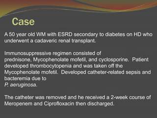 A 50-year-old man with a history of end-stage renal disease and diabetes underwent a kidney transplant. He later developed a nonproductive cough. Additional testing showed a new lung lesion and biopsy revealed Aspergillus fungus. Invasive pulmonary aspergillosis was diagnosed. Treatment guidelines recommend the antifungal drug voriconazole as the primary treatment, with alternative options including other antifungals depending on the patient's condition and test results.
