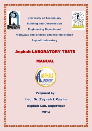 The document is a laboratory manual for asphalt testing prepared by Dr. Zaynab I. Qasim at the University of Technology, covering various tests such as penetration, ductility, loss on heating, and softening point. Each test includes objectives, principles, procedures, and grading criteria, providing technical details for students in the Building and Construction Engineering Department. The manual emphasizes the importance of proper report formatting and the analysis of results to ensure quality in engineering applications.