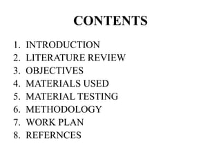 This document discusses using crumb rubber from waste tires in asphalt pavement. It begins with an introduction that notes the large volume of waste tires produced globally each year and the environmental issues with current disposal methods. The objectives are then stated as utilizing waste rubber in flexible pavement construction to reduce costs and natural resource usage. Various materials used are described, including aggregates, asphalt, and crumb rubber. Testing conducted on the materials is summarized. A literature review covers several papers on using crumb rubber in asphalt mixes. The methodology section outlines the test specimens prepared with different percentages of crumb rubber added. Marshall stability tests are then used to evaluate the mixtures and determine the optimal crumb rubber content.
