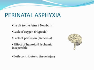 Perinatal asphyxia refers to lack of oxygen and poor perfusion experienced by the fetus or newborn during delivery or birth. This can lead to hypoxic ischemic encephalopathy and multi-organ system dysfunction in the newborn. Key criteria for diagnosing perinatal asphyxia include an umbilical cord pH less than 7.0, low Apgar scores for more than 5 minutes, and neurological or multi-organ abnormalities in the newborn period. The pathophysiology involves hypoxia, ischemia and reperfusion injury damaging cells and organs. Management focuses on supporting oxygenation, circulation, temperature and metabolism to prevent further brain injury.