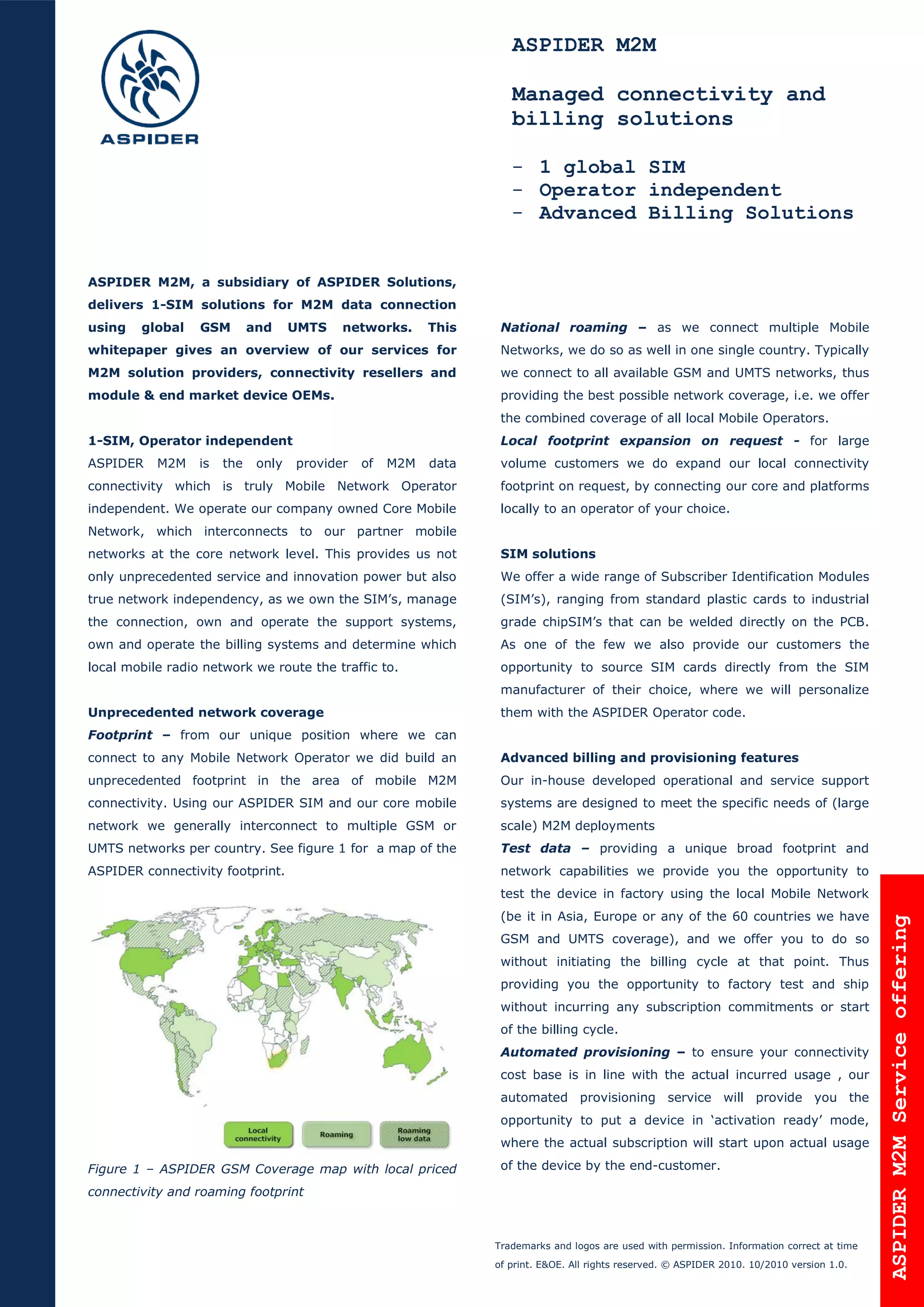 1) ASPIDER M2M provides a global 1-SIM solution for M2M connectivity using GSM and UMTS networks in over 60 countries.