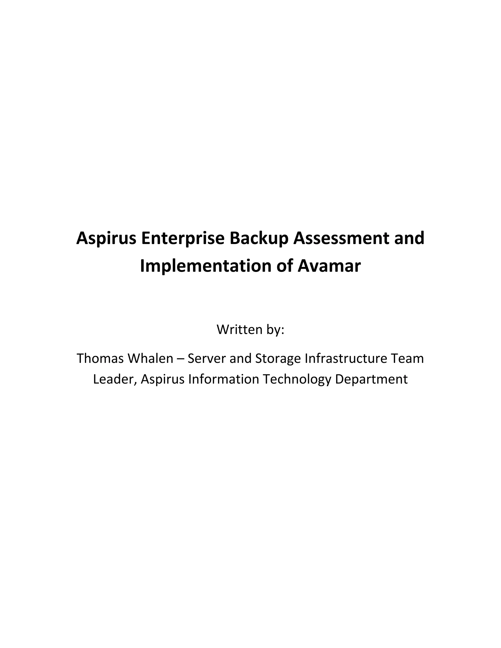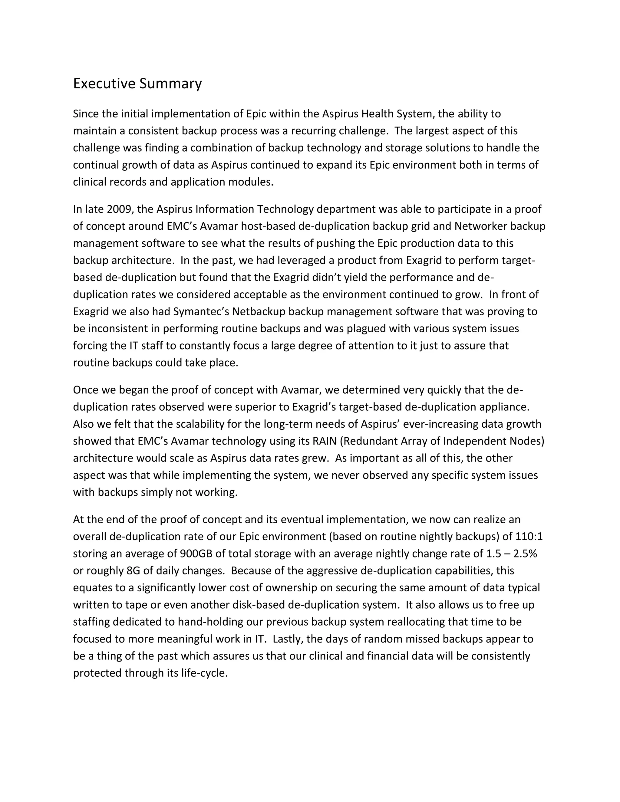 Aspirus implemented EMC's Avamar backup solution to address issues with long backup times and inconsistent backups using their previous Exagrid and NetBackup system. Testing showed Avamar provided significantly better deduplication rates of over 110:1 and reduced backup times from over 10 hours to under 6 hours. The improved performance, reliability and reduced storage needs provided by Avamar resulted in lower costs and allowed IT staff to focus on more strategic work.