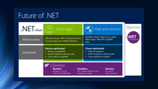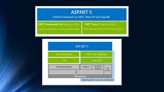 The document discusses the history and future of ASP.NET, including ASP.NET 5 which will be the next version. ASP.NET 5 will be cloud-optimized to run on Windows, Linux and Mac OS X. It will feature faster performance, modularity through packages, and be fully open source. Key aspects are a cloud-ready configuration, ability to self-host, simplified dependency management, and a single web stack for both web APIs and user interfaces.