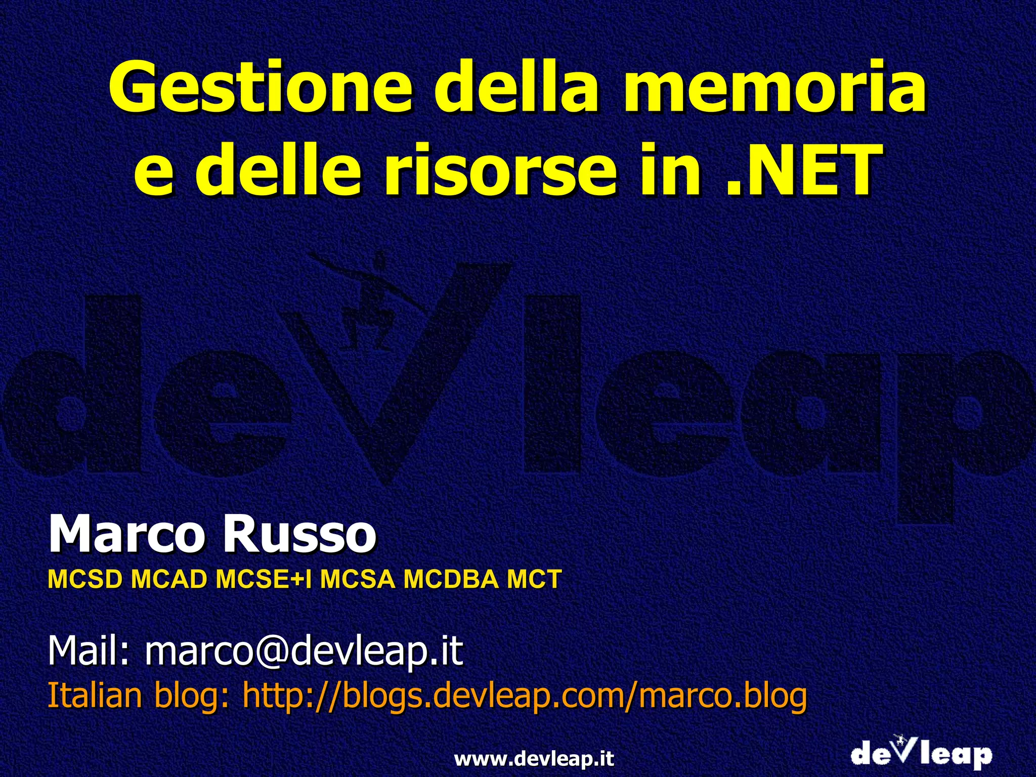 Il documento analizza la gestione della memoria e delle risorse nel framework .NET, evidenziando il funzionamento del garbage collector, comprese le fasi di mark e compact. Vengono esplorati vari algoritmi di garbage collection e il pattern IDisposable per una gestione efficace delle risorse. Inoltre, si discute l'importanza delle weak references e dell'ottimizzazione tramite un algoritmo generazionale per migliorare le performance dell'applicazione.