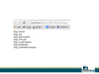 The document discusses the ASP.NET page lifecycle. It begins with an introduction explaining that a requested web page goes through a series of steps on the server before being returned to the browser. It then outlines the main stages of the lifecycle including initialization, load, processing of events, rendering, and unload. Finally, it provides more details on specific events within each stage such as Page_Init and Load and the order in which they are executed.