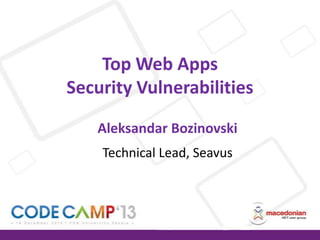 This document discusses various web application security vulnerabilities like injection, cross-site scripting (XSS), cross-site request forgery (CSRF), security misconfiguration, and insecure direct object references. It provides examples of each vulnerability and methods for preventing them, such as input validation, output encoding, using parameterized queries, and generating unique identifiers. The document also covers topics like HTTP, sessions, cookies and the importance of keeping software updated.
