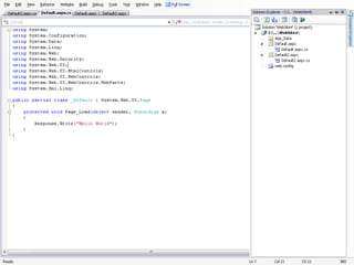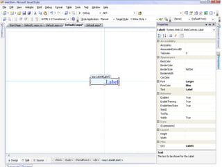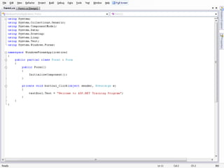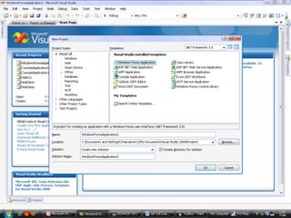 This document provides an overview of basic programming concepts and tools in Visual Studio. It discusses namespaces as containers that organize code and avoid naming conflicts. It also describes several Visual Studio tools like the Solution Explorer for managing solution files, Properties Editor for editing object properties, and Toolbox for adding controls to forms. Finally, it provides steps for creating a Windows Form application, adding controls, and debugging the application.