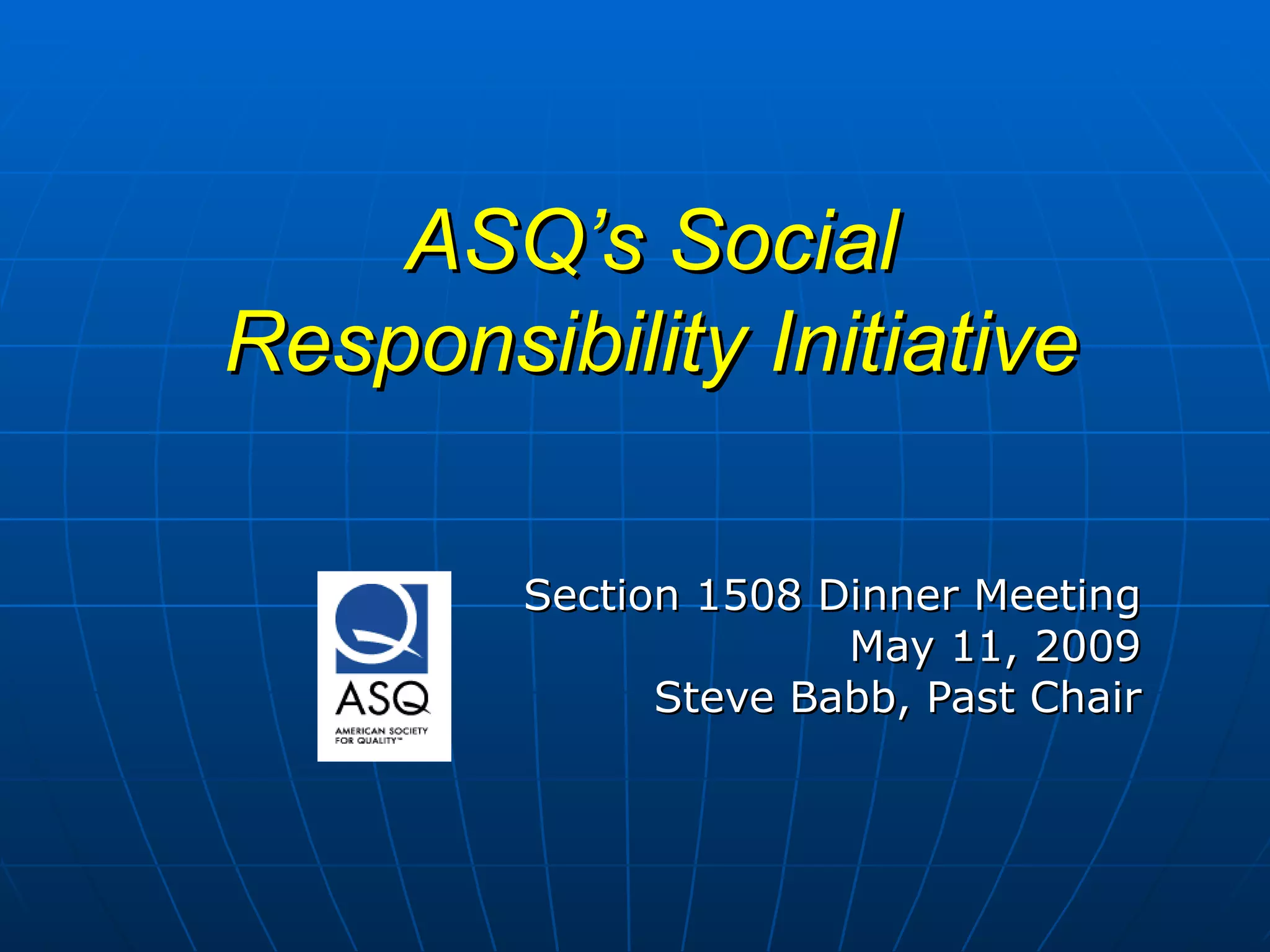 The document discusses ASQ's advocacy for social responsibility and how quality management tools can support socially responsible practices. It notes that 83% of respondents to a Quality Progress poll agreed that social responsibility should be part of quality management. Additionally, two-thirds of executives believe the economic turmoil has increased the importance of governance programs. The document proposes ways ASQ can develop tools and practices to help organizations implement social responsibility, including leveraging existing techniques like Lean and Six Sigma and understanding and promoting the emerging ISO 26000 standard on social responsibility.