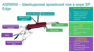 Документ предоставляет подробный обзор платформы ASR 9000 от Cisco, включая её архитектуру, основные компоненты и применение в различных сетевых сценариях. Описаны ключевые характеристики оборудования, включая маршрутизаторы, системы вентиляции и электропитания. Также документация охватывает спецификации производительности и возможности масштабирования для различных моделей ASR 9000.
