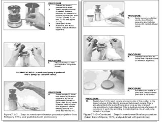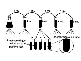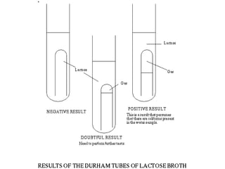 This document describes the MPN (Most Probable Number) test for testing biological water quality and detecting the presence of fecal contamination and pathogens. It involves testing for the indicator organism E. coli using a multiple tube fermentation technique with three phases - presumptive, confirmed, and completed tests. Samples are collected and stored properly then inoculated into lactose broth tubes at serial dilutions and incubated to detect coliform growth. Positive tubes are then tested with BGLB/MacConkey broth and EC/A1 broth to confirm total and fecal coliforms, respectively. Definitive identification involves plating and gram staining from positive confirmed tubes.