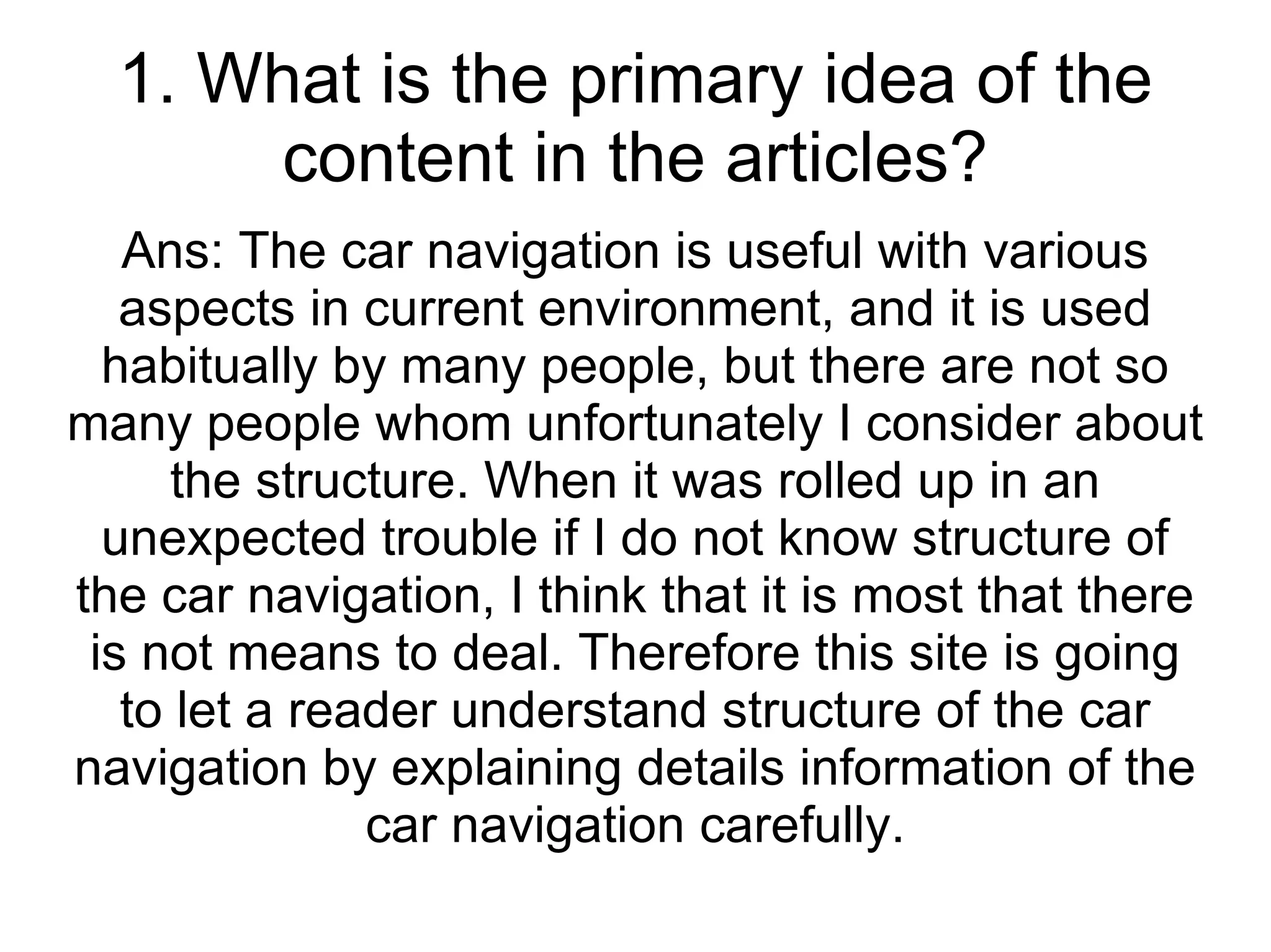 The document discusses the usefulness of car navigation systems and provides details on their structure and operation. It explains that car navigation allows users to easily plot routes to destinations using built-in maps and GPS. However, some technical terms used to describe the structure could be confusing. It suggests clarifying topics with introductory sentences and subheadings to improve understanding.