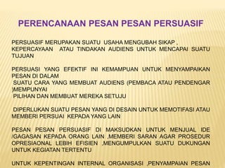 Dokumen ini membahas teknik penulisan pesan persuasif yang bertujuan untuk mengubah sikap atau tindakan audiens melalui perencanaan strategis dan analisis audiens yang mendalam. Dikenalkan juga teori kebutuhan Maslow sebagai dasar untuk memahami motivasi audiens dalam merespons pesan persuasif. Terdapat komponen penting dalam menyusun pesan persuasif, termasuk kredibilitas, kerangka argumentasi, dan penggunaan pemikat logika serta emosional.