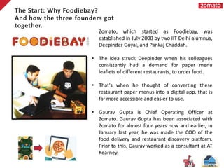 Zomato was established in 2008 by IIT Delhi alumni Deepinder Goyal and Pankaj Chaddah as Foodiebay. It aimed to convert paper restaurant menus into a digital app. In 2010, Foodiebay was renamed Zomato to go international. Zomato allows users to locate restaurants, enables restaurants to advertise, and has food reviewers. It faces challenges like data breaches and controversies over religious preferences of delivery agents. Zomato acquired various companies and launched new services like Hyperpure supplies platform and Zomaland food carnivals to expand. It has raised over $2.6 billion in funding from investors, becoming valued at $5.4 billion as it prepares for an IPO