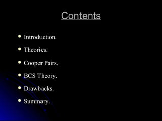 The document discusses the BCS theory of superconductivity proposed by Bardeen, Cooper, and Schrieffer. The key points are: