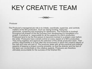 The document provides descriptions of several key job roles in the film industry, including producer, executive producer, script editor, assistant location manager, director of photography, production sound mixer, and director. It discusses the responsibilities and involvement of each role throughout the different phases of film production from pre-production to post-production.