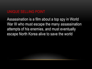 Dave Johnson is a top spy who must escape assassination attempts during World War III. While on a mission in North Korea, he is captured and imprisoned. He meets fellow spy Scarlet Edwards and they work to escape North Korea. There is a final fight as they try to leave. They return to the US with information that prevents a missile attack. Dave and Scarlet are rewarded for their heroic efforts.
