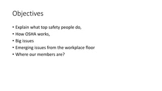 1) Objectives to explain what safety professionals do, how OSHA works, big issues, emerging workplace floor issues, and where members are located.
