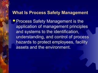This document provides an overview of Process Safety Management (PSM), highlighting its importance in identifying and controlling process hazards to protect employees and the environment. It outlines the 14 key elements of PSM, such as employee participation, process hazard analysis, and incident investigation, along with compliance requirements under OSHA regulations. Additional guidance is offered for managing changes, training, and preparing for emergencies to ensure a safe working environment.