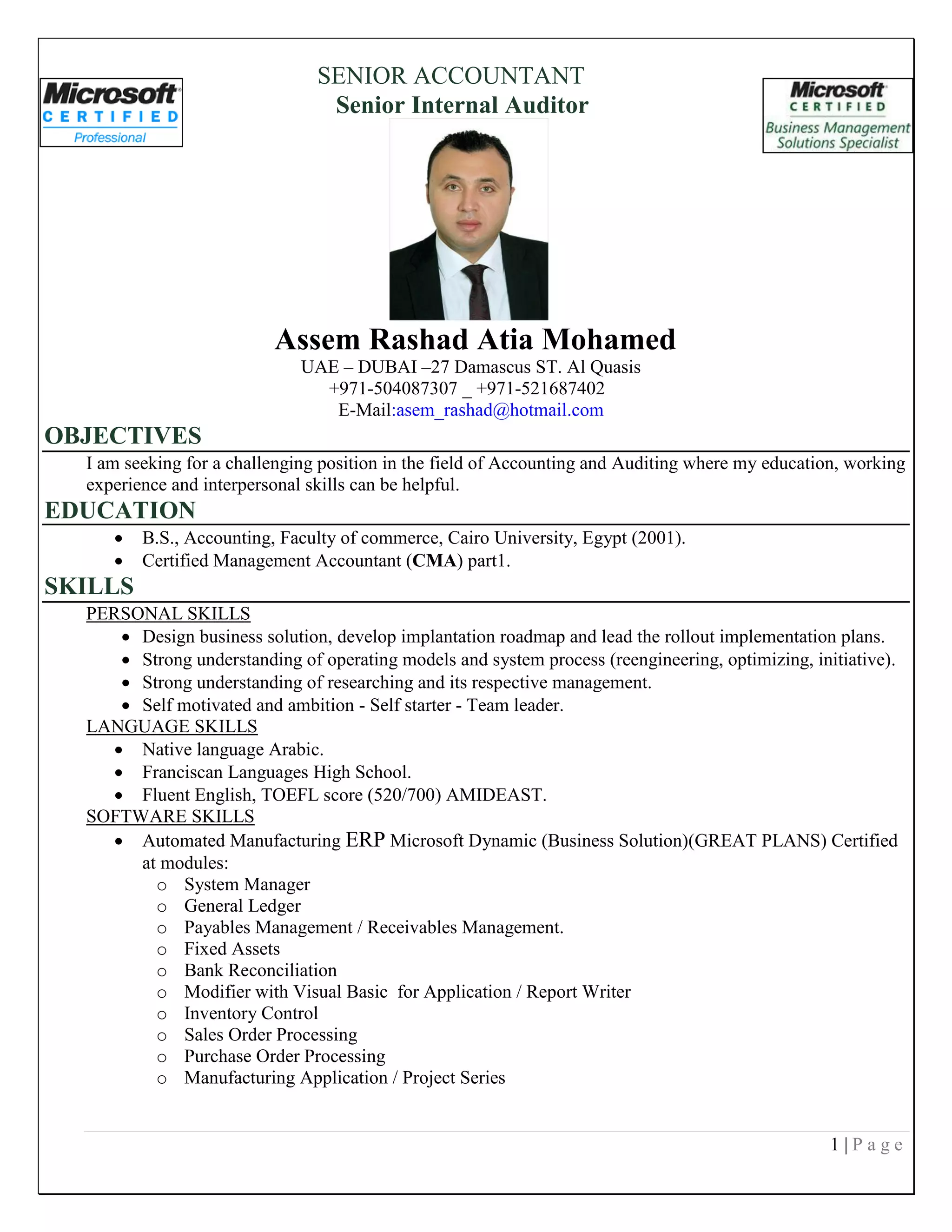 This document is a resume for Assem Rashad Atia Mohamed, seeking a position in accounting and auditing. It outlines his education including a B.S. in Accounting from Cairo University and CMA certification. It also details his relevant work experience, including his current role as Accountant Manager at 5ALL International FZE in Dubai and previous roles in accounting, auditing, and financial management in Egypt. Finally, it lists his technical skills in ERP systems and accounting software, as well as ongoing training to remain knowledgeable in finance, management, and information technology.