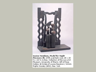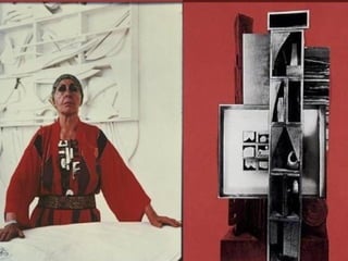 Assemblage involves bonding found objects together to create sculptures. It allows artists to give new meaning to everyday items. Famous assemblage artists include Marcel Duchamp, who created readymades like Bicycle Wheel and Fountain, and Louise Nevelson, who assembled wood scraps into monumental black sculptures. Robert Rauschenberg is also known for his combines, which merged paintings and found objects into mixed media works like Monogram, featuring a stuffed goat.