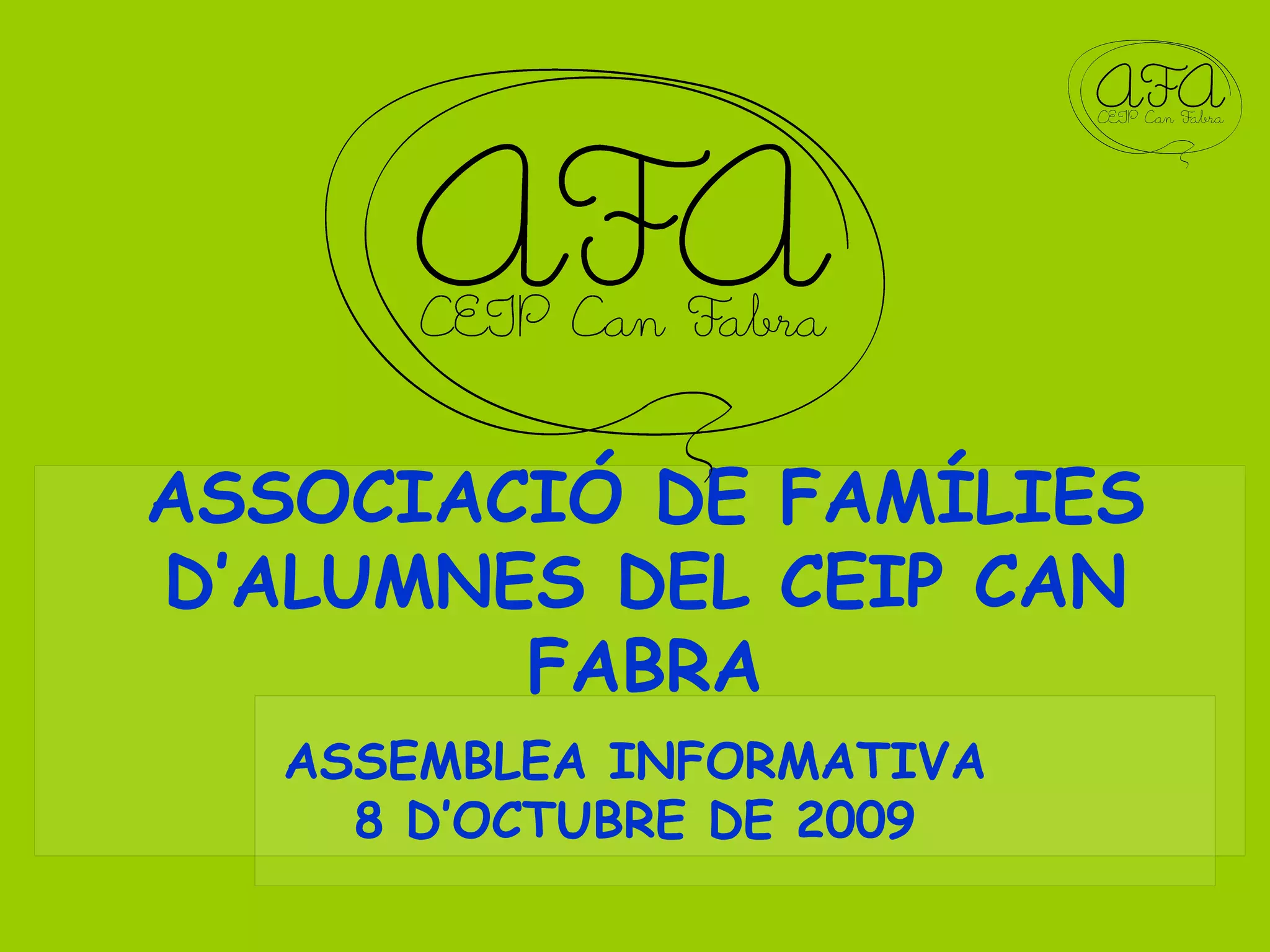 ASSOCIACIÓ DE FAMÍLIESD’ALUMNES DEL CEIP CAN FABRA ASSEMBLEA INFORMATIVA 8 D’OCTUBRE DE 2009