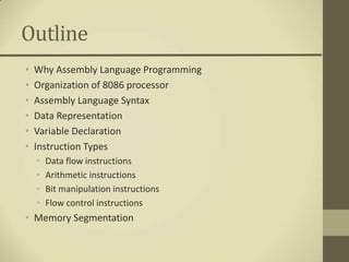 This document provides an outline for a course on 8086 Assembly Language Programming. It begins with an introduction to machine language and assembly language. It then covers topics like the organization of the 8086 processor, assembly language syntax, data representation, variables, instruction types, memory segmentation, program structure, addressing modes, and input/output. The document is intended to guide students through the key concepts needed to program in 8086 assembly language.