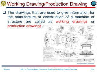 The document provides information on creating assembly drawings, including defining the different types of assembly drawings (pictorial, outline, sectioned), how to construct an assembly, the typical content and components of assembly drawings (such as parts lists, balloons, dimensions), and examples of assembly drawings. It also discusses standard parts, exploded views, and how to identify individual parts in an assembly drawing.