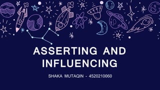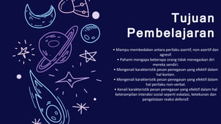 Dokumen tersebut membahas tentang ketegasan dan pengaruh. Terdapat beberapa poin penting yang diangkat, yaitu karakteristik perilaku asertif, non-asertif, dan agresif; faktor-faktor yang mempengaruhi kemampuan seseorang untuk mempengaruhi orang lain seperti kompetensi, reputasi, dan ketergantungan; serta pengaruh budaya terhadap perilaku asertif. Dokumen ini juga membahas mengenai mempengaruhi se
