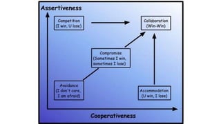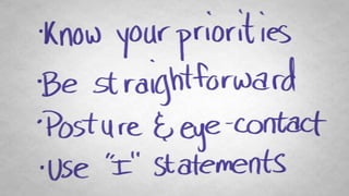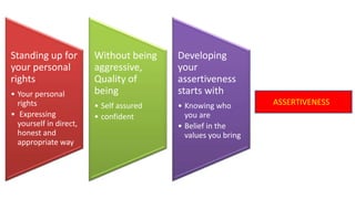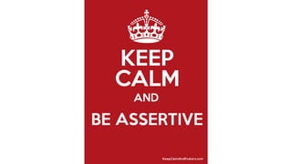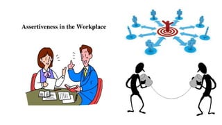 The document emphasizes the importance of assertive communication in the workplace, highlighting it as a means to express personal rights and needs while respecting others. It discusses the consequences of neglecting assertiveness, including low self-esteem and submissiveness, and suggests strategies for organizations to foster assertiveness among employees. The document also addresses the balance between assertive, passive, and aggressive communication styles, advocating for self-awareness and the right to respectful treatment in the workplace.