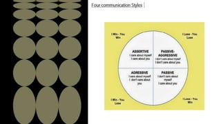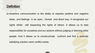 Assertive communication is the ability to express oneself openly and honestly while respecting the rights of others. It is contrasted with passive, aggressive, and passive-aggressive communication styles, and is characterized by traits such as eye contact, appropriate body language, and clear intent. The document outlines techniques for assertiveness and emphasizes the importance of mutual respect, self-esteem, and the ability to confront conflicts constructively.