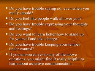 This document provides information about assertive communication. It defines assertiveness as honestly expressing opinions, feelings, and rights without infringing on others. The benefits of assertiveness include avoiding depression, resentment, frustration, anxiety, and poor relationships. Specific techniques for assertive communication are outlined, such as using "I" statements and making clear requests. Difficult situations like criticism can be handled through techniques like "broken record" and "fogging." Learning assertiveness improves self-respect and leads others to treat one with more respect.