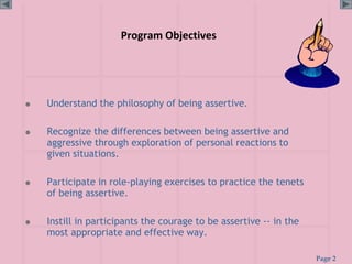 The document outlines the objectives and importance of assertiveness, defining it as an honest and direct expression of one's feelings while recognizing the differences between assertive and aggressive behaviors. It provides self-assessment questions to gauge assertiveness and dispels common myths, emphasizing individual rights and effective communication techniques. Additionally, it offers practical tips for conveying assertive attitudes, such as maintaining eye contact and using a firm voice.