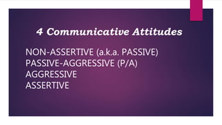 The document provides guidance on being assertive when communicating with others. It defines four main communicative attitudes: non-assertive, passive-aggressive, aggressive, and assertive. The assertive approach uses "I" messages to describe your feelings and needs without blaming others. The document outlines techniques for delivering assertive messages, including using facts over judgments, owning your feelings, and asking open-ended questions. It also provides examples of applying assertiveness in different situations through role-playing exercises.
