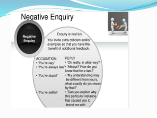Assertiveness involves respecting oneself and others while clearly communicating feelings and ideas. It allows one to stand up for themselves while also considering others' opinions. There are three types of communication styles - passive, aggressive, and assertive. Assertive communication respects both parties' rights by directly and honestly expressing thoughts and feelings without judgment. It aims to find win-win solutions through fair, calm discussion.