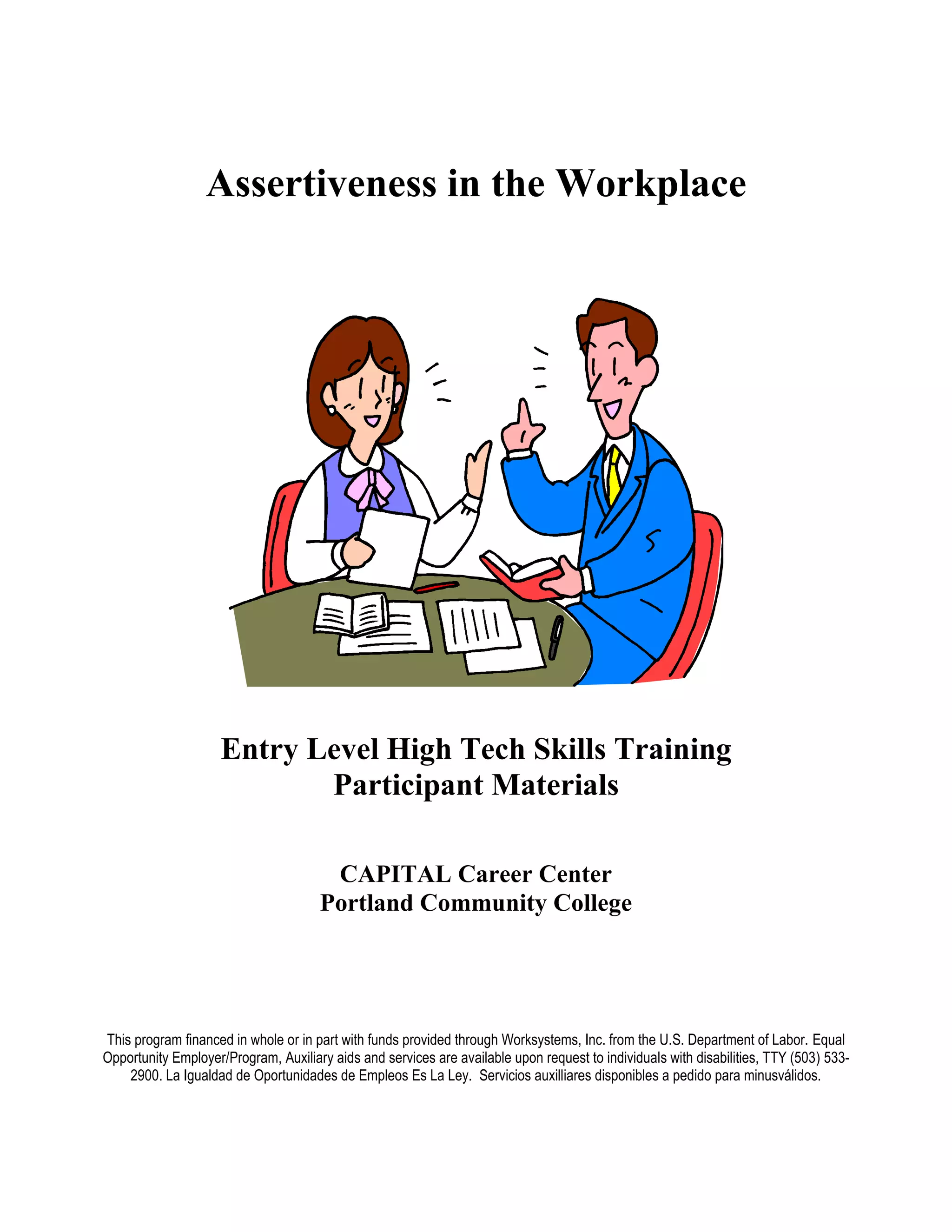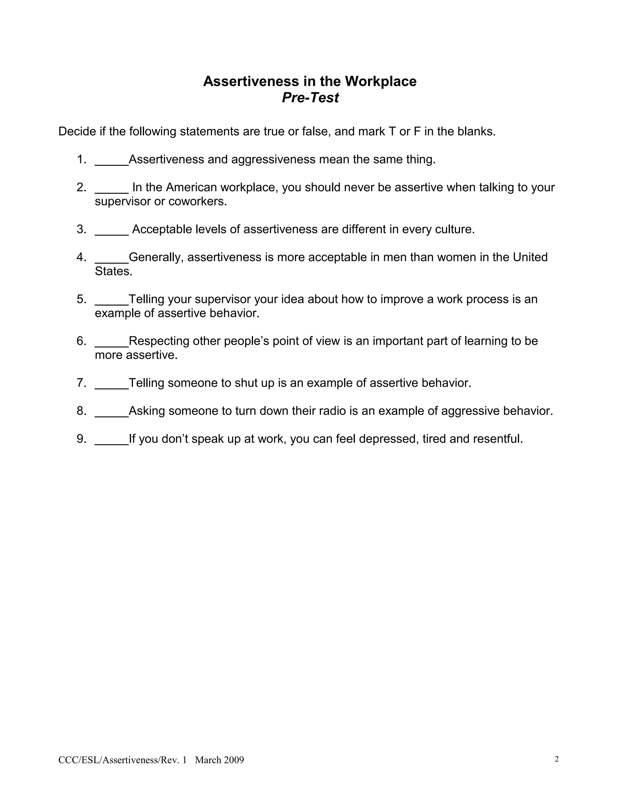 This document discusses assertiveness in the workplace. It begins with a pre-test to assess the reader's understanding of assertive versus aggressive behaviors. It then provides definitions of assertiveness, explaining that it involves honestly communicating one's feelings, opinions and needs while also respecting others. It notes that assertiveness is important for well-being and effective relationships. The document offers tips for becoming more assertive, such as asking for clarification, respecting boundaries, and saying no directly. It closes by noting cultural differences in communication styles and the importance of understanding other perspectives.