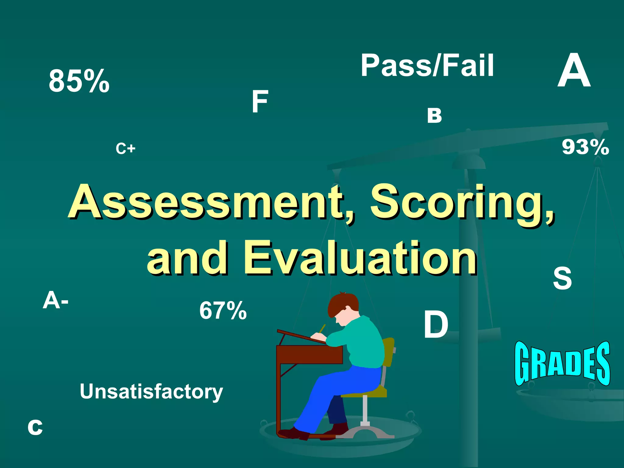 This document discusses assessment, scoring, and evaluation in education. It defines key terms like assessment, scoring, and evaluation. It describes different types of assessments like formative and summative assessments. It discusses alternative assessments like projects, presentations, and portfolios. It also covers criteria for effective assessments like validity, difficulty, and discriminability. Evaluation can be criterion-referenced, norm-referenced, or use a curve. The document provides examples of assessing scientific process skills and tips for grading, handling appeals, using portfolios, and record keeping.