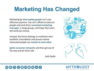 2) Mythology offers "Assessimize" services to assess key marketing areas like brand, social media, lead generation, and internal alignment in order to optimize strategies and drive measurable results.