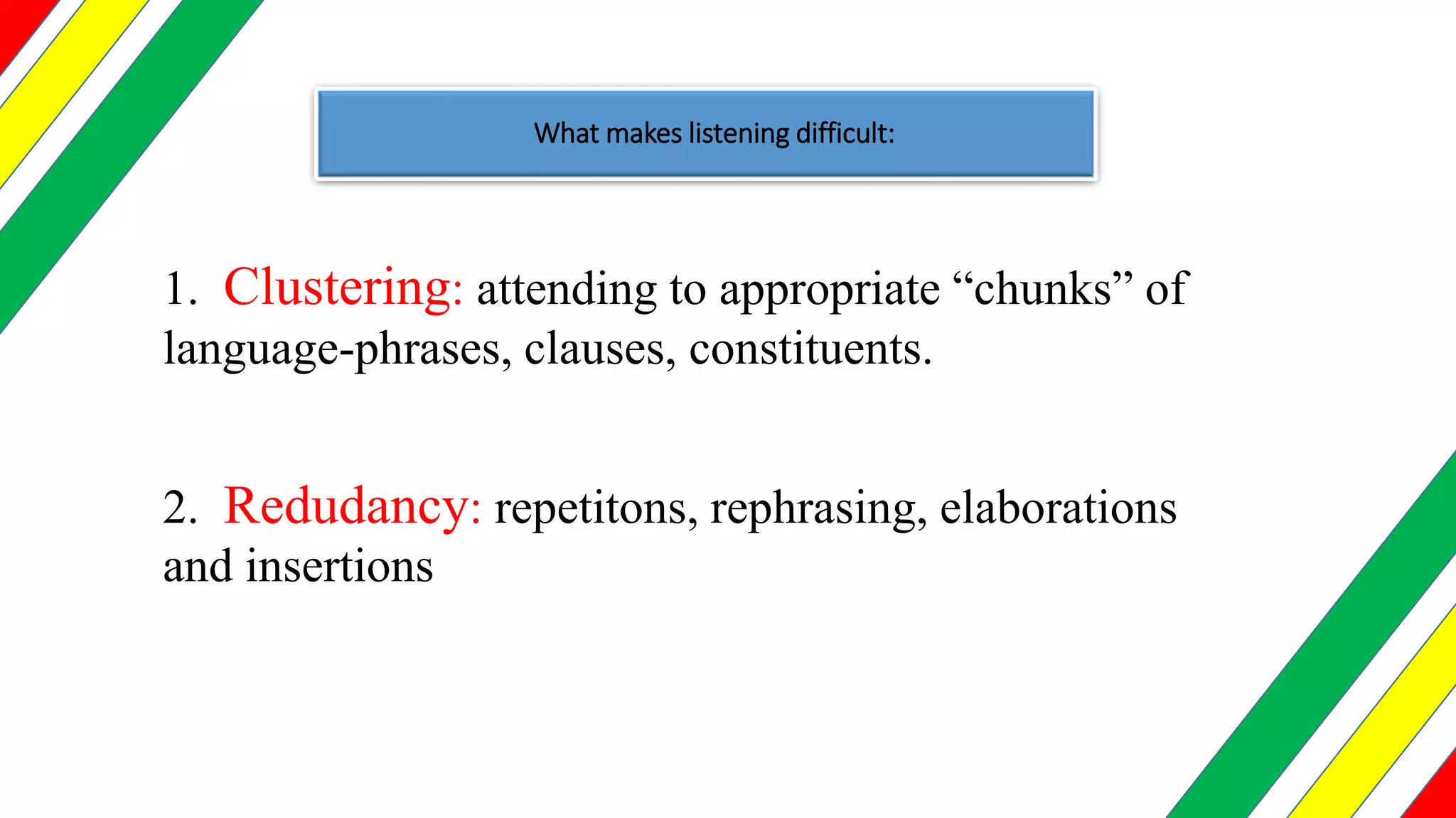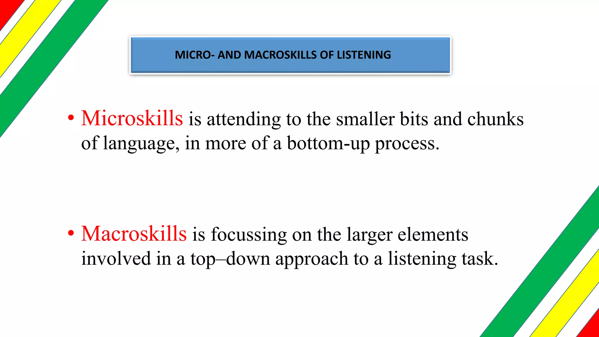 The document discusses microskills and macroskills in listening, which refer to bottom-up and top-down processing. It then lists 8 factors that make listening difficult, such as reduced forms, rate of delivery, and stress/intonation. Next, it proposes assessment tasks to test intensive listening, including recognizing phonological/morphological elements and paraphrasing sentences and dialogs. Finally, it suggests tasks for responsive listening like answering questions appropriately or with open-ended responses.