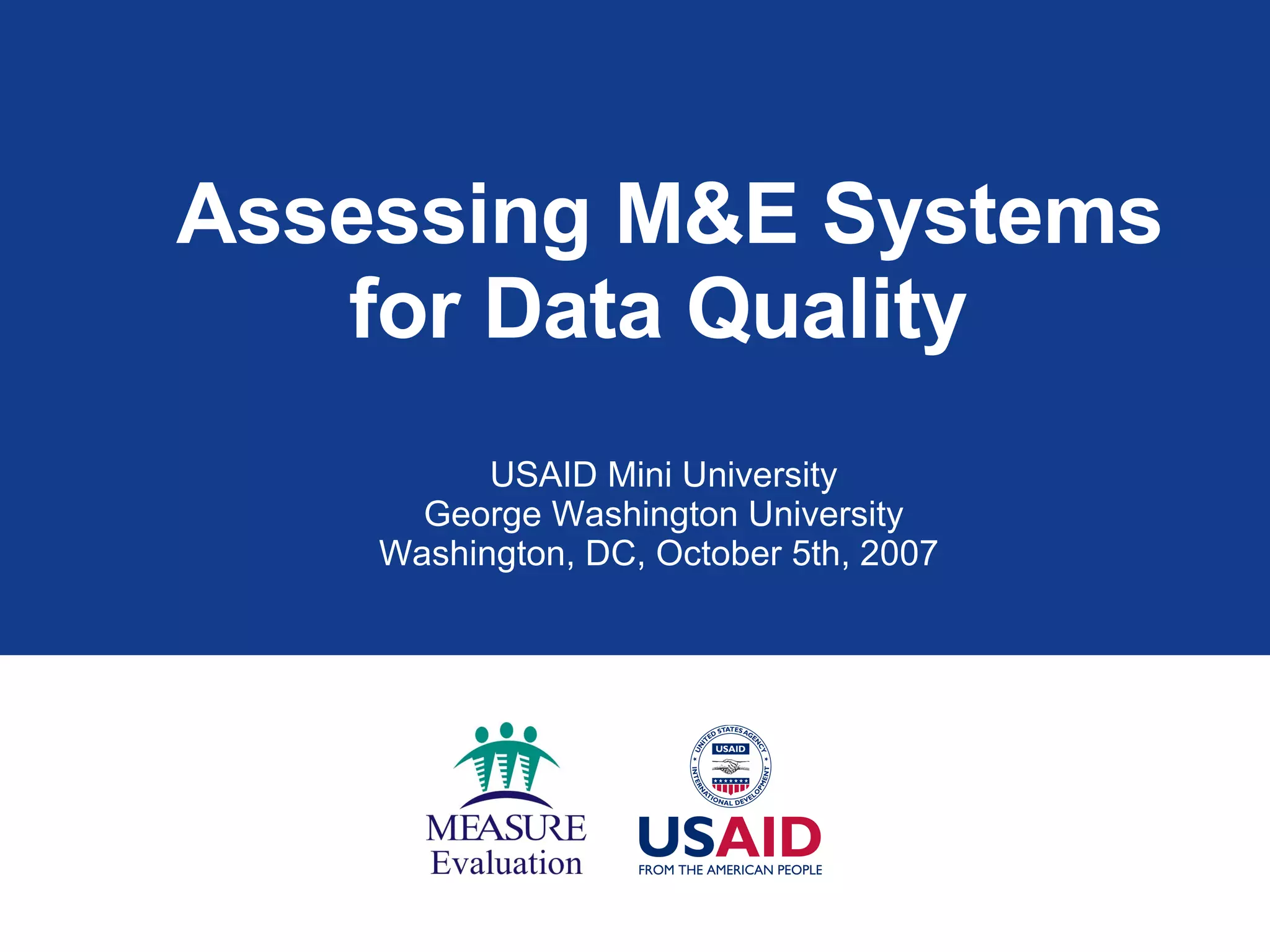The document discusses the importance of data quality for monitoring and evaluation systems. It describes seven key dimensions of data quality - accuracy, reliability, completeness, precision, timeliness, integrity and confidentiality. It also outlines the different levels of an M&E system from service sites to national reporting and the roles and responsibilities needed at each level to ensure quality data collection, reporting and use. Tools are presented for strengthening M&E systems and assessing data quality.