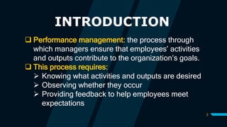 The document outlines the performance management process that helps align employee activities with organizational goals through setting expectations, observing performance, and providing feedback. It discusses the strategic, administrative, and developmental purposes of performance management, along with various methods and criteria for effective measurement, as well as potential legal and ethical issues within the system. The document also addresses the importance of regular feedback and the need for a legally defensible performance management system to avoid discrimination and unjust dismissal lawsuits.
