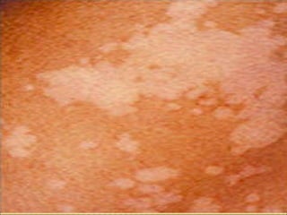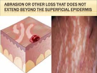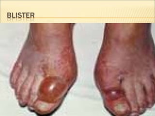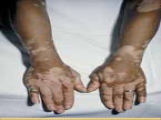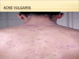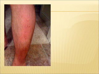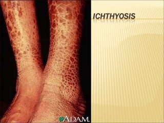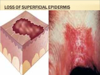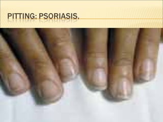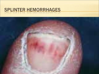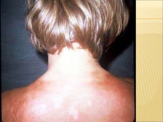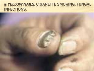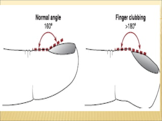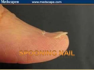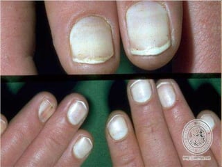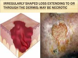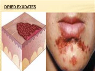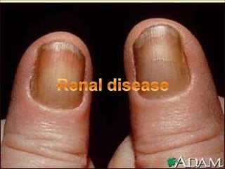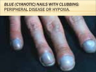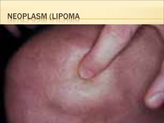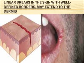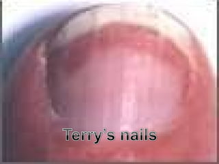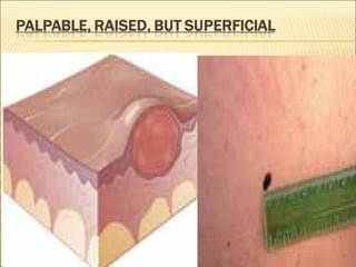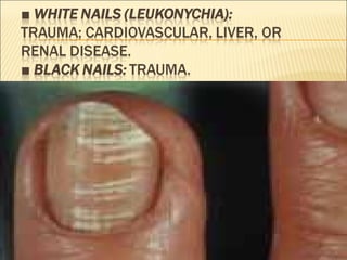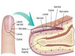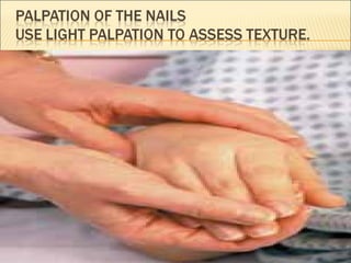 The document summarizes the key structures and functions of the integumentary system. It describes the layers of the skin, including the epidermis and dermis. It also discusses hair, nails, and glands. Assessment of the integumentary system involves inspection of the skin, hair, and nails to evaluate color, lesions, vascular changes, and other characteristics. Physical examination techniques include inspection and palpation.