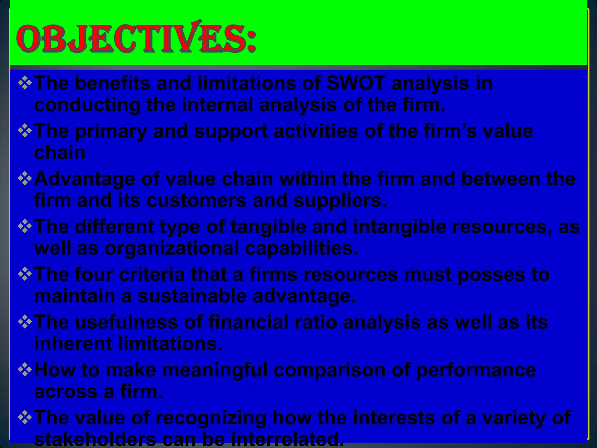 The document discusses assessing a firm's internal environment, including conducting SWOT and value chain analyses to evaluate strengths, weaknesses, and competitive advantages. It describes the primary and support activities in a value chain, such as inbound logistics, operations, outbound logistics, marketing and sales, service, technology development, and general administration. The document also covers assessing a firm's tangible, intangible, and organizational resources based on whether they are valuable, rare, difficult to imitate or substitute. Financial ratio analysis and stakeholder interests are mentioned as additional factors for internal assessment.