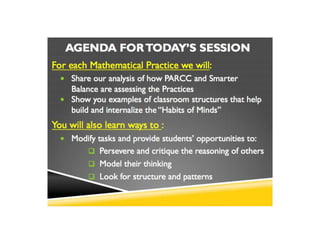 How are the Mathematical Practices (MPs) of the Common Core being assessed by PARCC and Smarter Balanced? What classroom structures and routines support student success? How can tasks be modified to increase the development of MPs 1, 2, and 3? Walk away from this session with easy-to-implement classroom routines and simple ways to modify tasks to meet the increased rigors of national assessments.