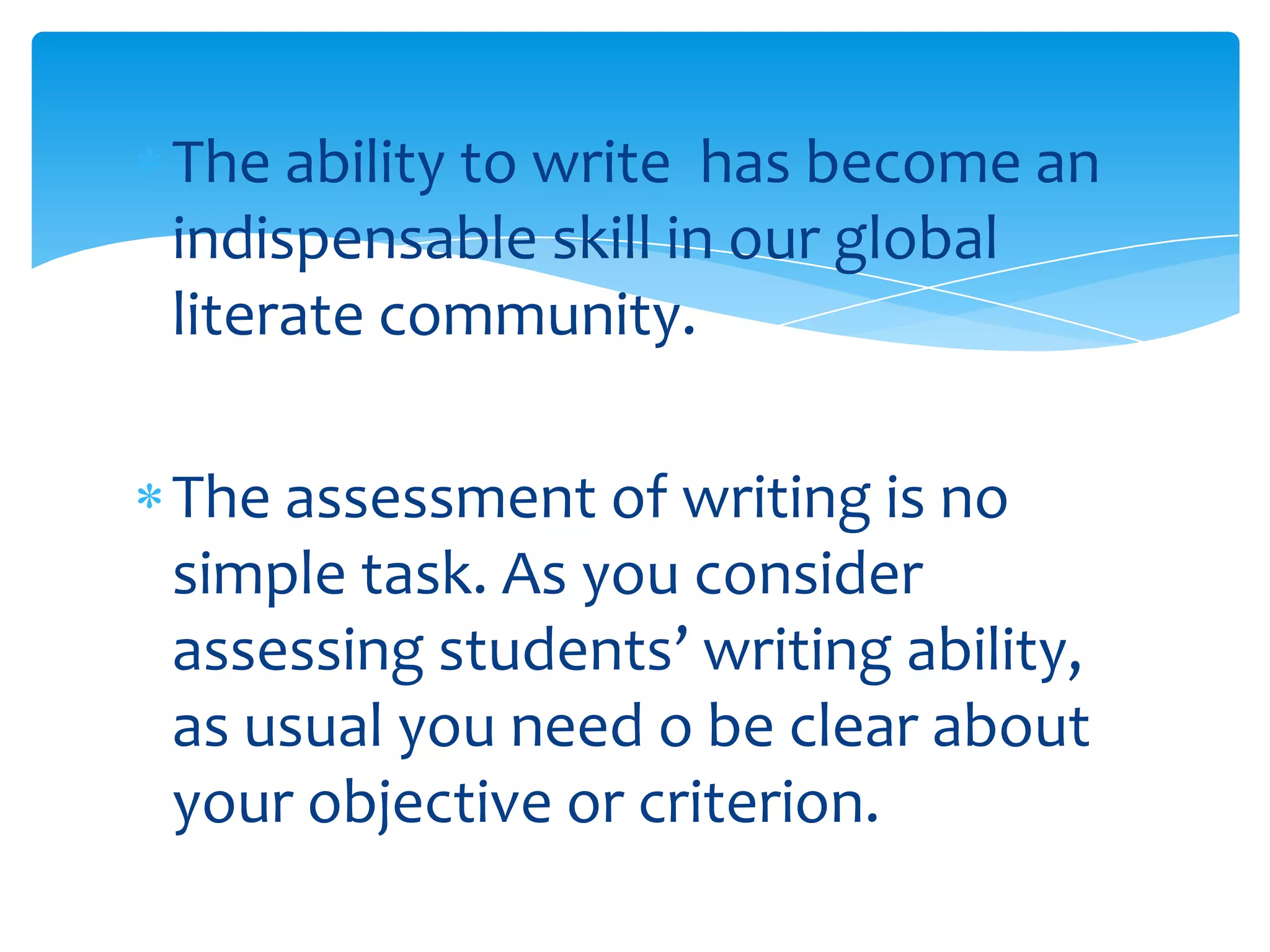 This document discusses approaches to assessing writing ability. It identifies 5 types of writing: imitative, intensive (controlled), responsive, extensive, and job-related. For imitative writing, tasks focus on handwriting, copying, and spelling. Intensive writing focuses on using correct vocabulary, grammar, and form within a context. Responsive writing connects sentences and paragraphs around a topic. Extensive writing involves longer essays and research projects. Micro-skills include spelling, handwriting, and grammar, while macro-skills involve organization, purpose, and conveying meaning. The document provides examples of assessment tasks for different writing types and skills.