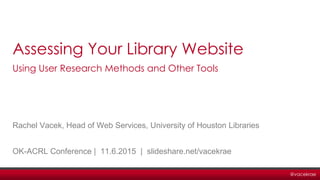 The presentation by Rachel Vacek at the OK-ACRL conference discusses assessing library websites through user research methods, including content audits, usability benchmarks, and analytics. It highlights key metrics from user data, such as browser and device usage, and emphasizes the importance of combining qualitative and quantitative insights for effective website maintenance. Tools for identifying user needs and improving findability and usability are also explored, along with potential benefits for library services.