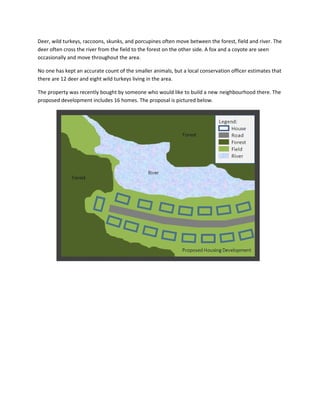 The document describes a field, forest, and river habitat area that is home to various plant and animal communities. It notes that a developer wants to build 16 homes in the area as shown in an attached proposal. The summarizer is asked to identify problems the development could cause habitats, draw an alternate development plan, and describe how it would impact habitats and convince people.