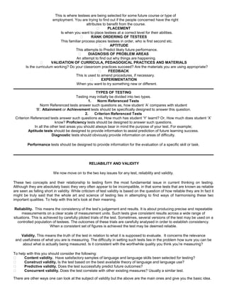 The document discusses various methods of assessment in education. It defines assessment as collecting information on student learning through measurement and evaluation. Measurement involves assigning numbers to student attributes, while evaluation makes judgements on student performance. The document also discusses the purposes of assessment as providing feedback on learning, progress, strengths and weaknesses. It outlines different types of assessment tools like norm-referenced tests which compare students and criterion-referenced tests which measure learning against objectives. The key aspects of reliability and validity in effective assessment are also summarized.